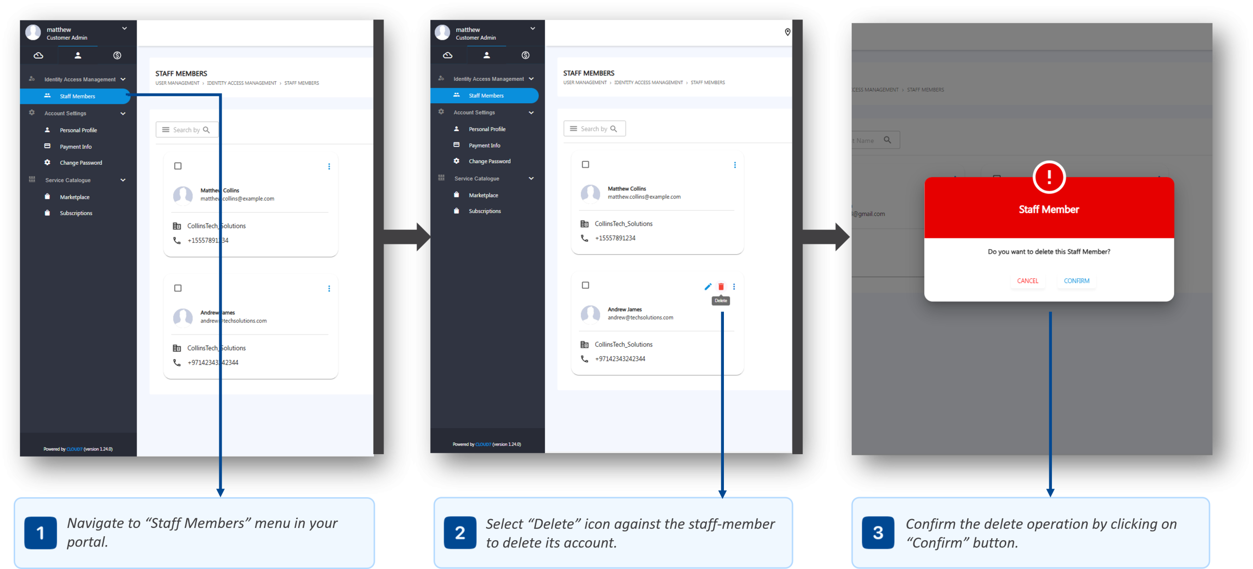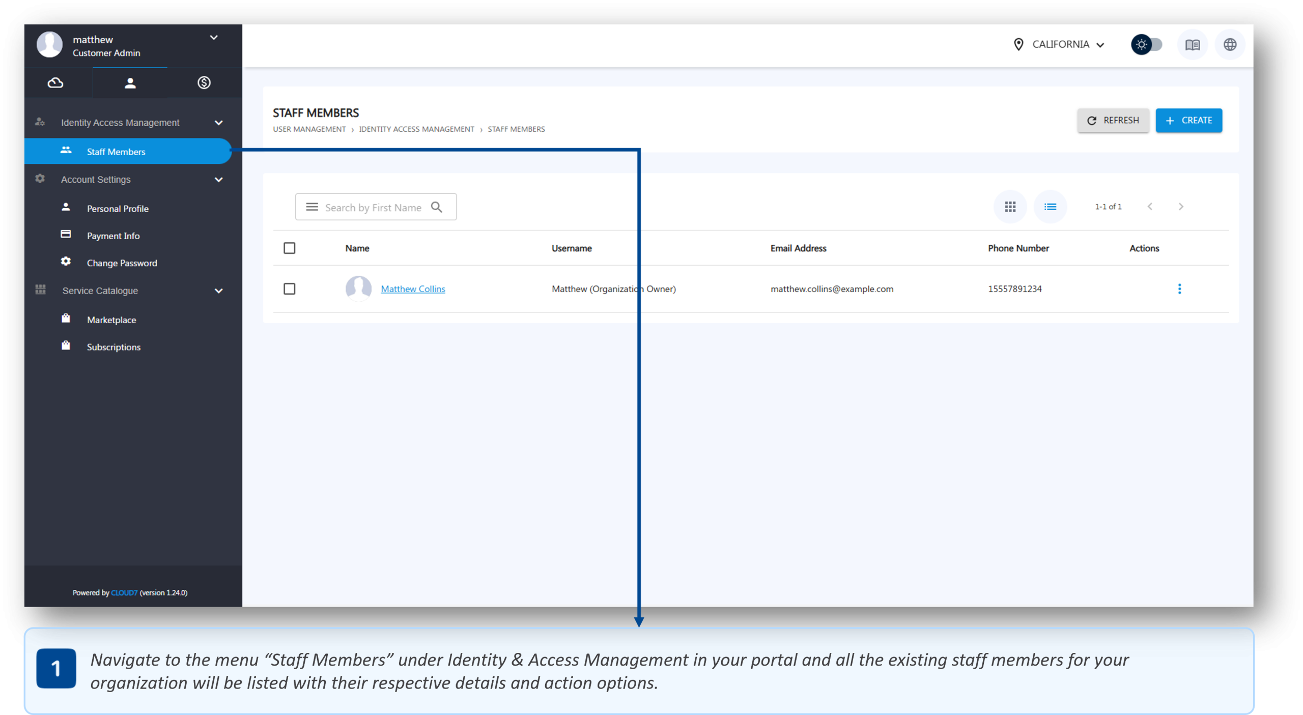 - To list Staff Members associated with your organization, log in with your account credentials (or a staff member with the necessary privileges) and navigate through the menu path: User Management >> Identity & Access Management >> Staff Members.