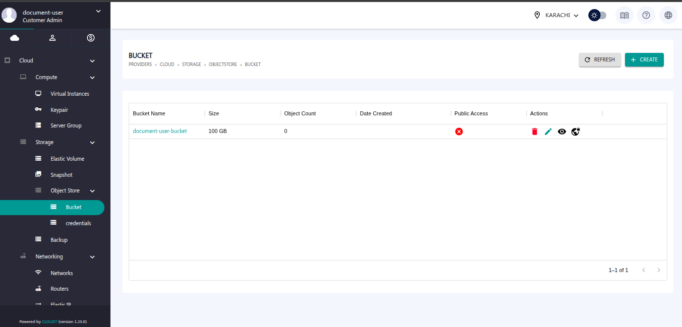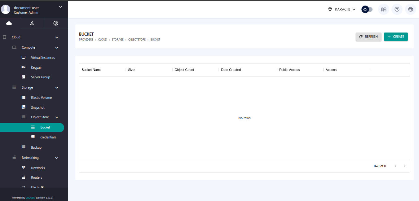 From the left-hand menu, go to the Object Store > Bucket. The bucket list will be displayed on this dashboard.