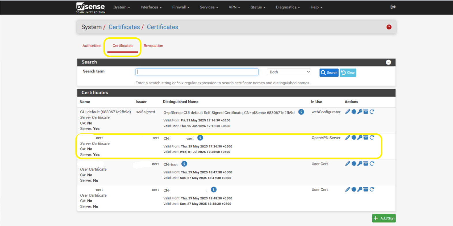- Look for the certificate that is in use — it will usually mention something like “OpenVPN Server” under the “In Use” column.