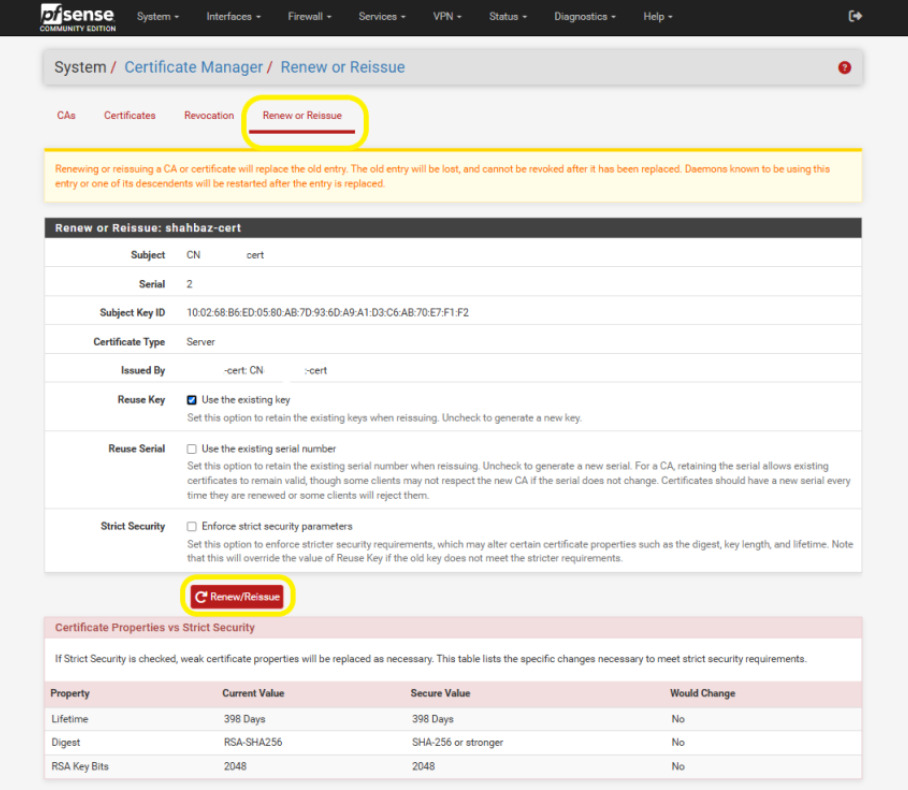 - You will now be on the System / Certificate Manager / Renew or Reissue screen.