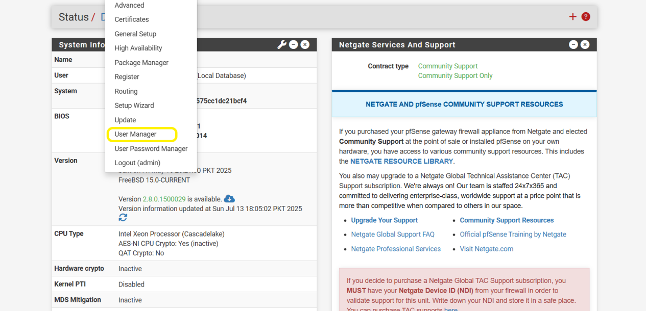 - From the pfSense Home Screen, go to the top menu and click: